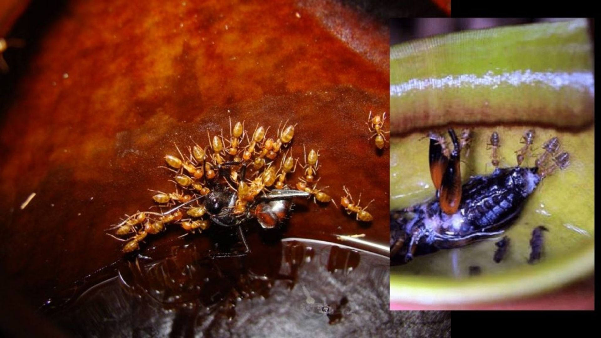 หม้อ Nepenthes bicalcarata เลี้ยงมดช่วยดำน้ำลงไปเก็บเหยื่อชิ้นใหญ่มาย่อยให้เล็กๆ